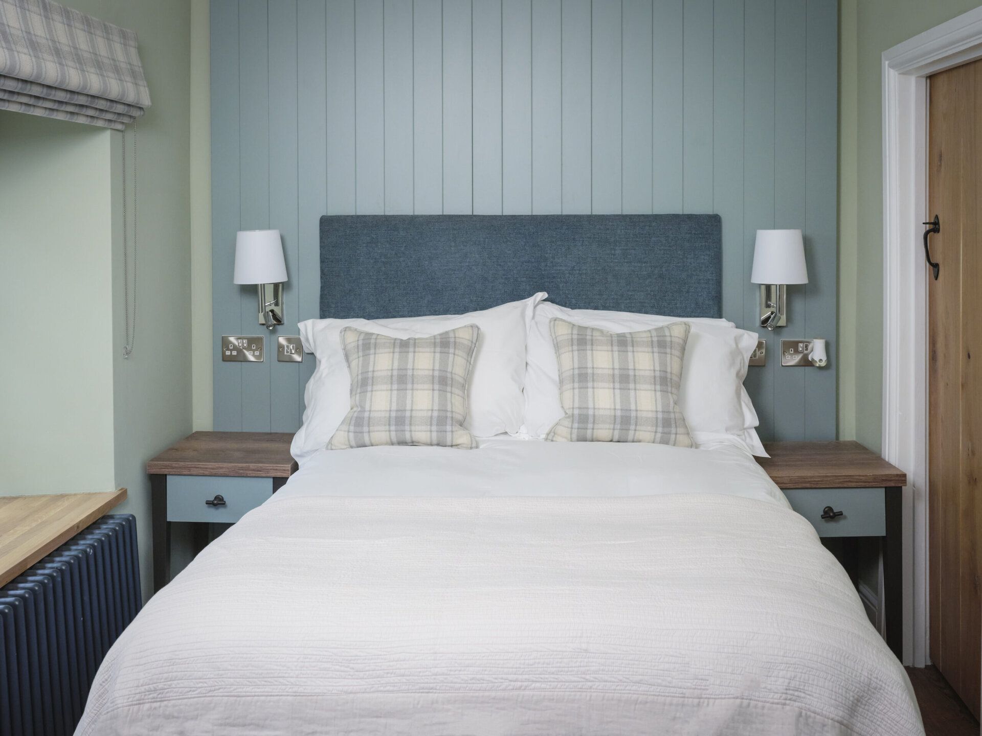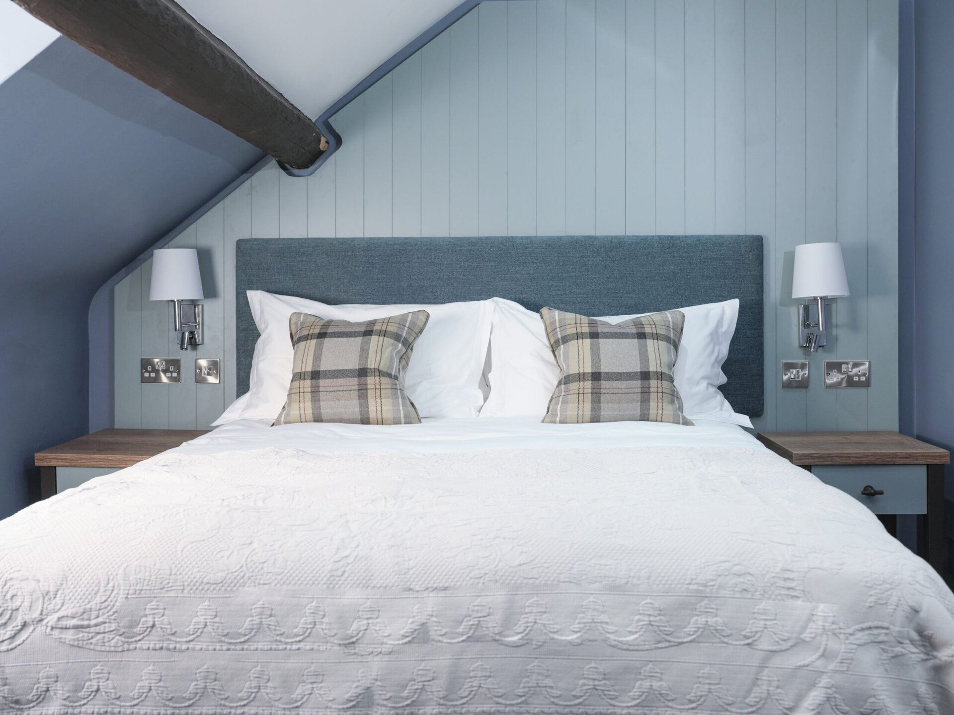 Snug attic retreat with slate-blue panelling and a bespoke teal headboard. Relax on a plush queen-size bed with underfloor heating, enjoy your own en-suite shower, and take in the valley views from the window seat. Named for the rolling Berwyn hills.