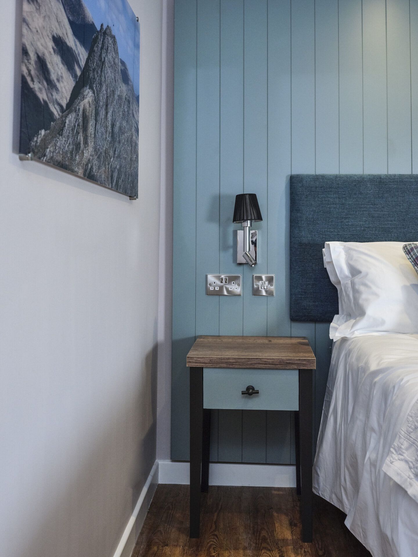 Calm double with soft green walls and a bespoke teal headboard. Enjoy a plush queen-size bed, underfloor heating and your own private en-suite shower for a truly restful stay. Named for the iconic mountain.